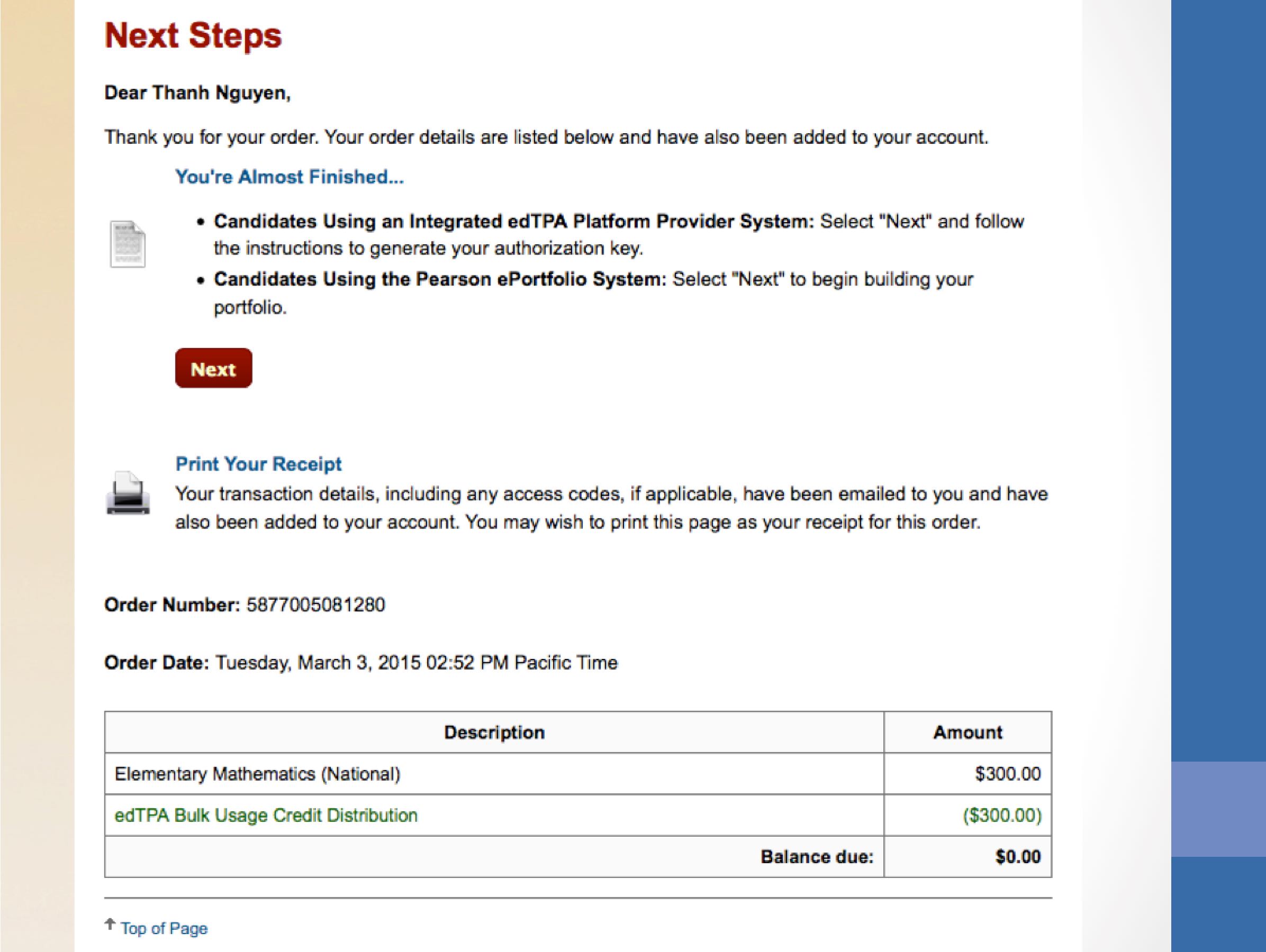 Pearson will direct you to pay before moving forward to the next step. If you are adding a voucher, there will be a specific link on the cart menu screen. They will email you a copy of your receipt but for safety reason, just screen shot the screen in case there was a glitch on their end. You will need to screen shot this information and physically write the authorization key down. Always have a second way of saving information.